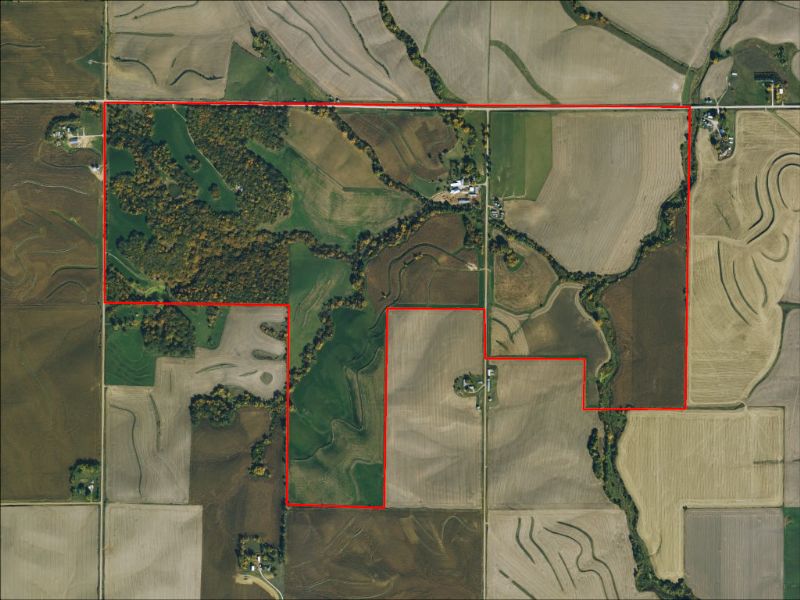 Fantastic opportunity in Woodbury County. Main hunting area is around 160 acres of timber, mostly oak, with the clearings seeded to an alfalfa-grass mix. Farm has two ponds and two creeks, providing an attractive avenue for deer travel throughout.